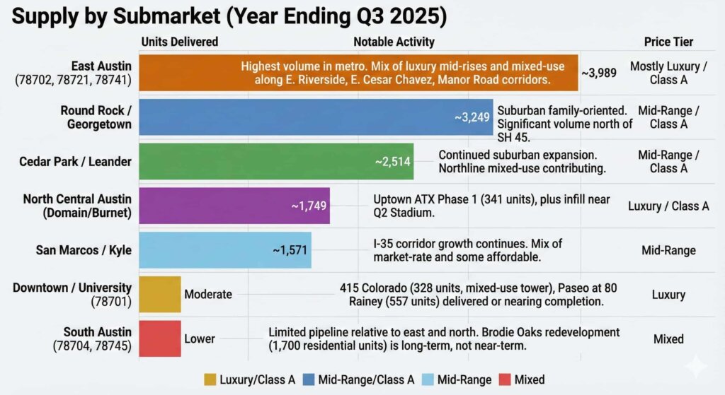 Which Austin neighborhoods have the most new apartment construction? East Austin led all submarkets with roughly 3,989 units delivered in the year ending Q3 2025, followed by Round Rock/Georgetown (~3,249), Cedar Park (~2,514), and North Central Austin including the Domain area (~1,749). Downtown saw targeted high-rise deliveries, while South Austin had comparatively less new supply.