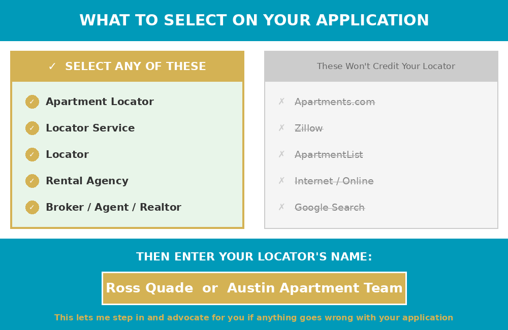 - On your application: Enter “Ross Quade – Austin Apartment Team” in the referral field