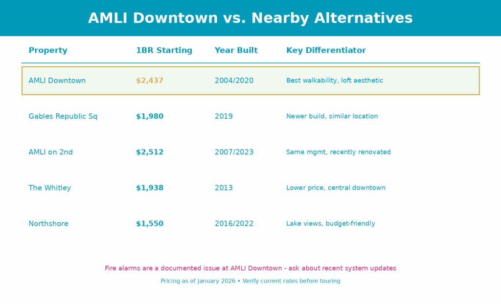 | AMLI on 2nd | $2,512 | 2007/2023 | Same management, renovated | Similar issues possible |