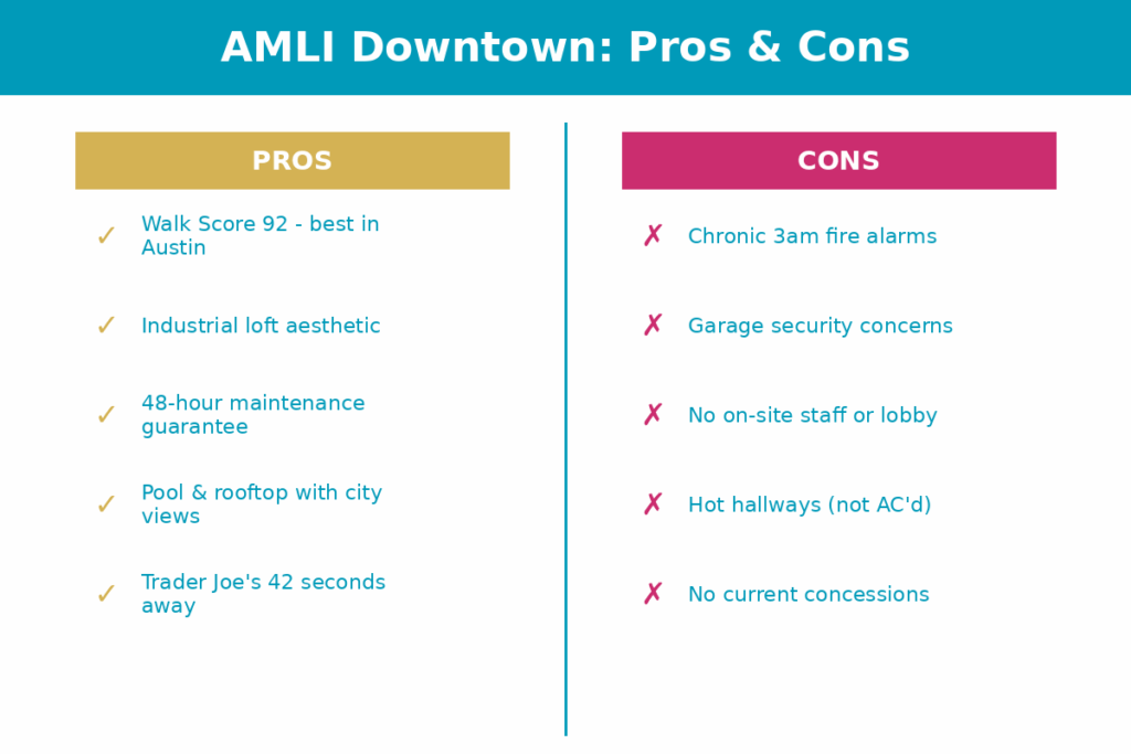 The good news? AMLI Downtown Austin delivers exactly what it promises: a walkable downtown address with concrete-floor lofts, rooftop views, and a pool that actually gets used. The bad news? There’s a fire alarm situation that’s become a running joke among residents. A very unfunny, 3am kind of joke.