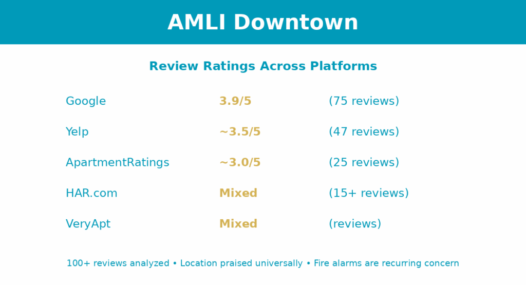 Last updated: January 2026 Pricing verified via AMLI website and Apartments.com Reviews analyzed: Google (75), Yelp (47), ApartmentRatings (25), HAR, VeryApt. Pricing, specials, and availability change frequently. Always verify current info directly with the AMLI Downtown leasing office.
