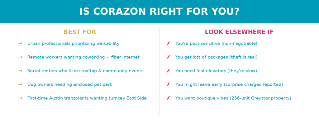 Corazon delivers solid value for East Austin if you go in with eyes open. Tour multiple units. Ask about pest history for the specific unit you’re considering. Document everything at move-in and move-out.