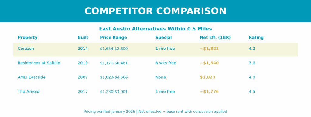 Choose Residences at Saltillo if you want direct MetroRail access, qualify for SMART Housing (which drops studios to around $1,079), or want newer construction. Fair warning: reviews mention package theft and gate issues there too. This seems to be an East Austin thing, not just Corazon.