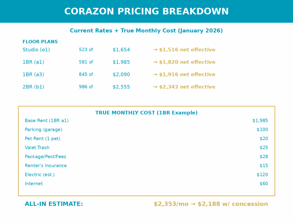 As of January 2026, Corazon is offering 1 month free on a 12-month lease. That brings a $1,985 1BR down to about $1,821 net effective. Verify this is still active before touring. Specials change weekly.
