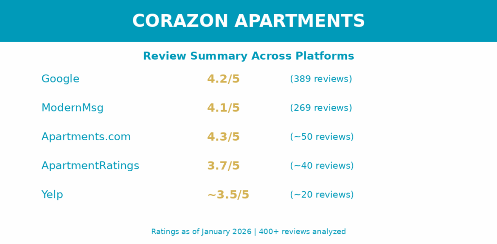 Article updated: January 2026 with reviews analyzed: 400+ across 5 platforms. Pricing and specials change frequently so make sure to verify current rates directly with The Corazon leasing office before applying.