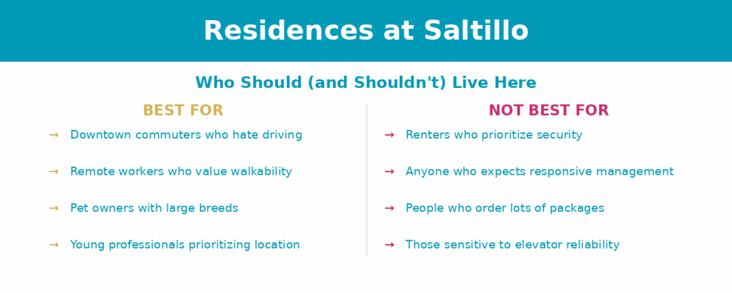 But you need to accept the trade-offs. The security situation is documented and ongoing. The Fetch package system frustrates residents. Management responds to complaints but doesn’t fix the underlying problems. If those issues would keep you up at night, look elsewhere.