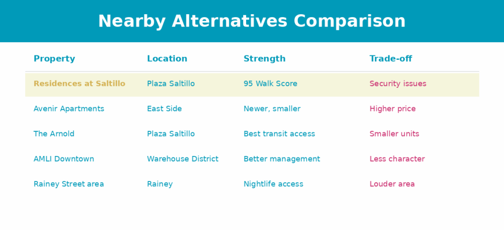 Avenir Apartments — Just 0.4 miles from Saltillo in the same East Side district. Newer construction, similar walkability, smaller community feel. Pricing runs slightly higher, but you’re getting a more intimate property with fewer units. Worth touring if the 703-unit scale of Saltillo feels overwhelming.