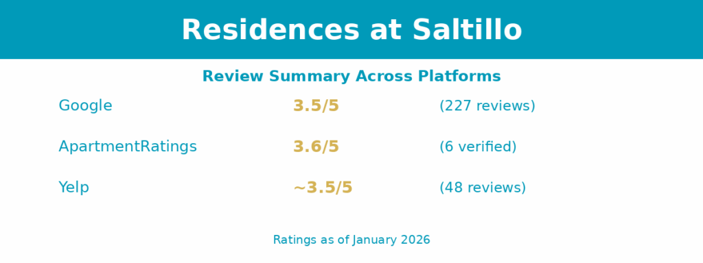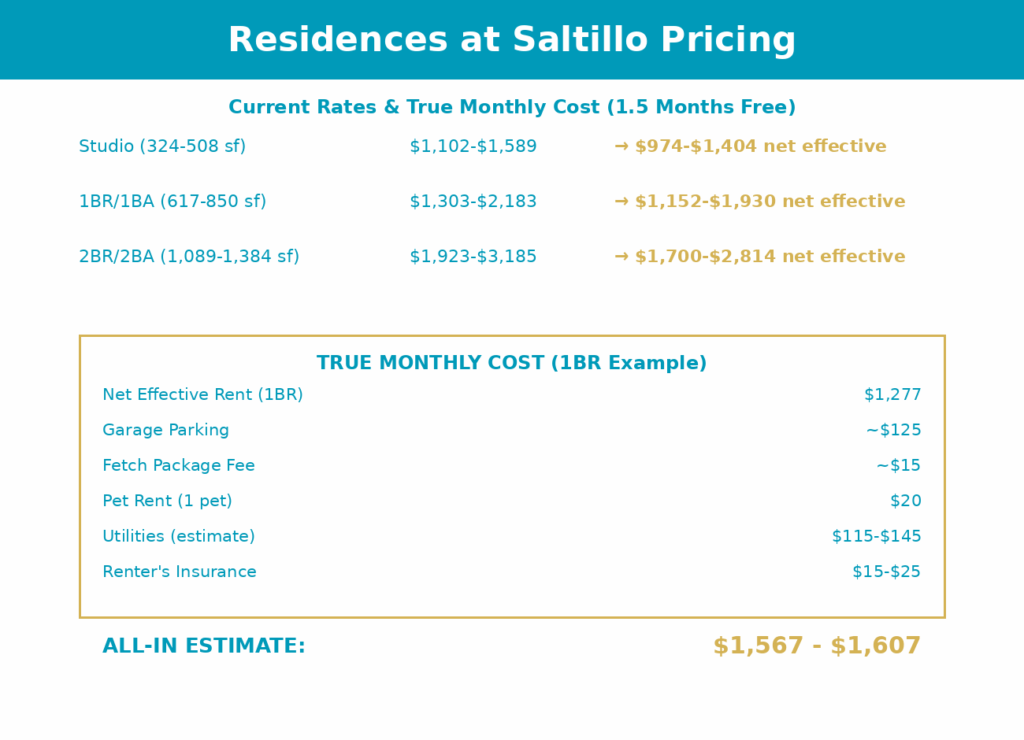 Last updated: January 2026. Pricing and specials change frequently. Verify all details directly with the leasing office at Residences at Saltillo before applying.