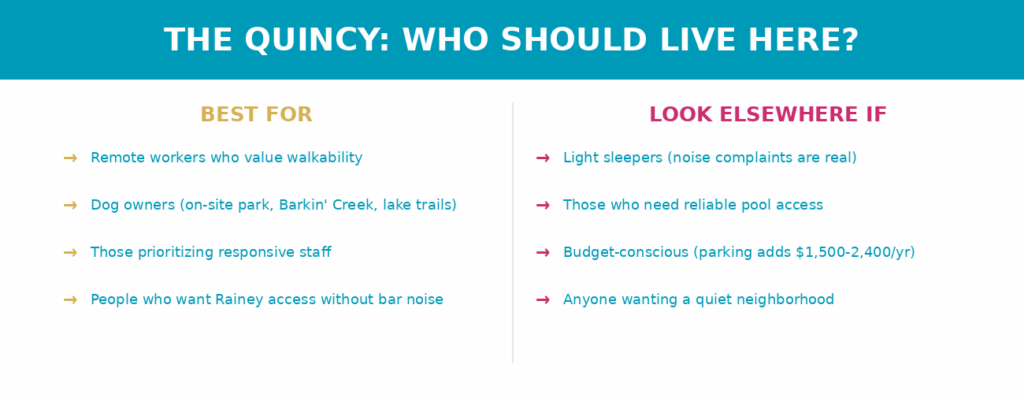 The honest verdict: The Quincy is a well-run building in a prime location with above-average amenities and responsive staff. The soundproofing concerns are real, and you’re paying a premium for the Rainey Street address. If the location fits your lifestyle and you can stomach $2,500+ for a one-bedroom, it delivers. If you need quiet or value, there are better fits.