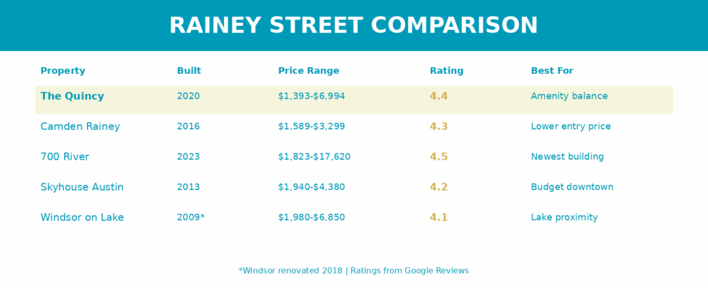 My take on value: At $3.20+ per square foot for a 1-bedroom, The Quincy isn’t cheap. You’re paying a premium for the Rainey Street address, the views, and the amenity package. If location and building quality are your priorities, it delivers. If you need more space for your money, the suburbs will stretch your budget further.