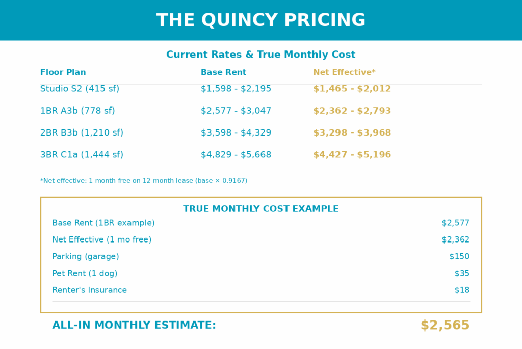 The Quincy offers studios through three-bedrooms. Pricing varies wildly depending on floor plan, floor level, and whether you’re looking at income-restricted or market-rate units.