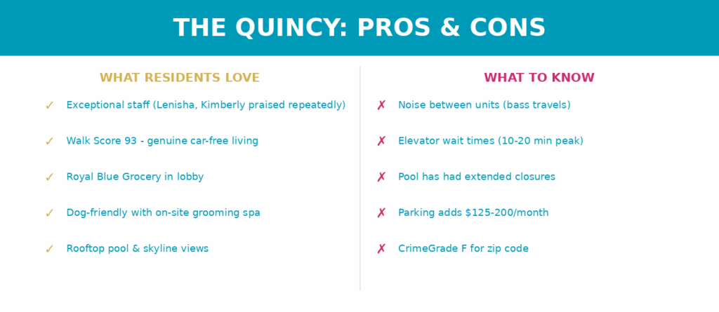We’ve toured most of the downtown high-rises and tracked which buildings deliver on their marketing. If you want a shortlist tailored to your situation, whether it’s The Quincy or something that fits better, reach out.