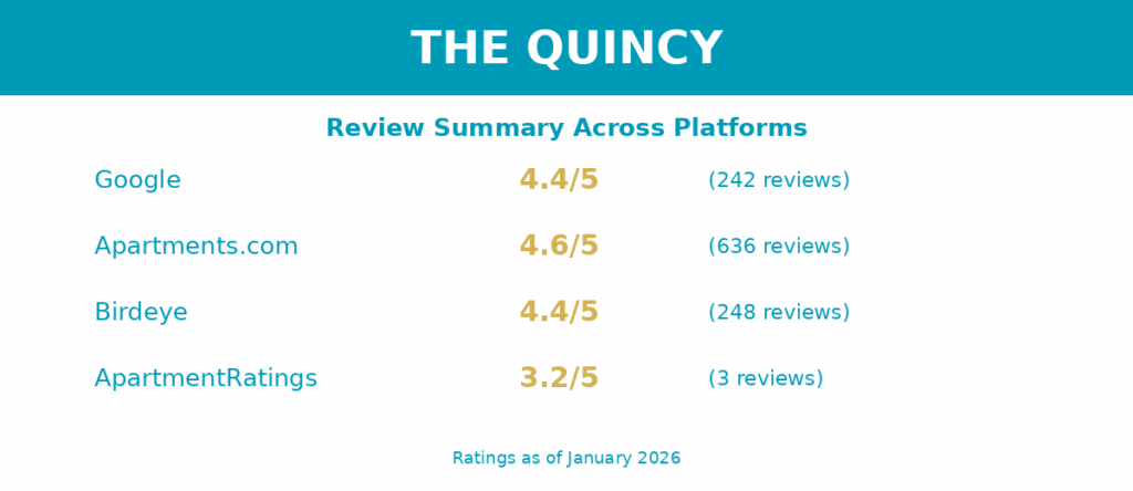 | The Quincy | 2020 | $2,536 | ~$2,325 | 4.4/5 | Royal Blue Grocery, rooftop terrace |