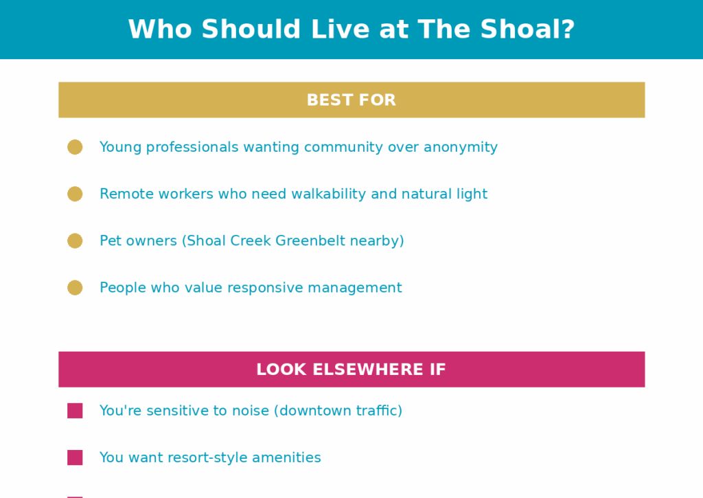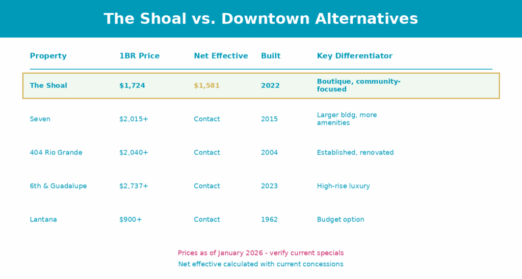 If you want the high-rise experience with doormen and rooftop pools, you’ll pay $2,700+ at places like Sixth and Guadalupe. If you want budget downtown, look at renovated older buildings. The Shoal is for people who want new construction and community without the high-rise premium.
