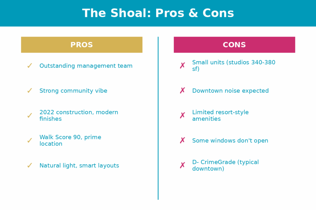 The Shoal sits in an interesting middle ground. It’s not the cheapest option (Lantana is). It’s not the most amenity-rich (newer high-rises are). What you’re paying for is: