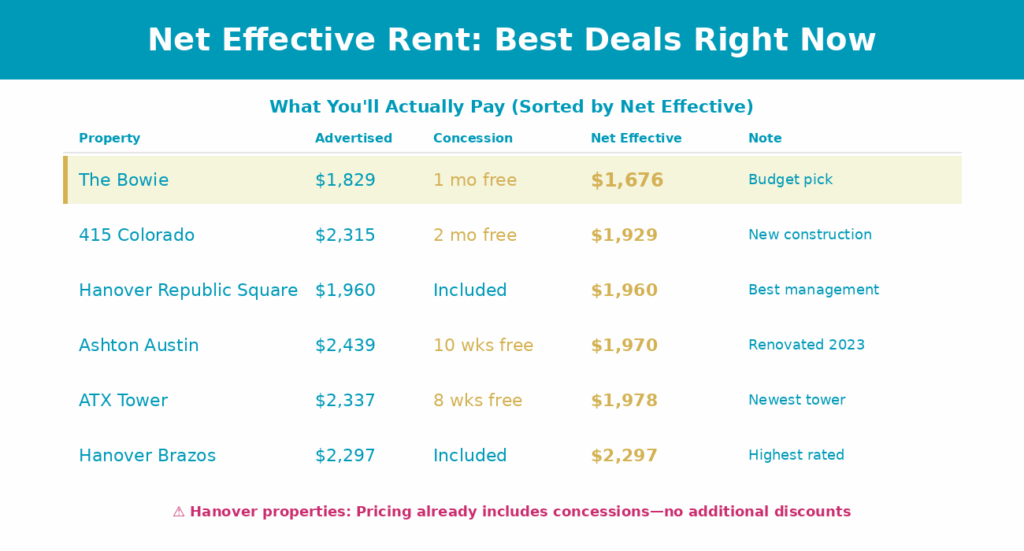 As of January 2026: Ashton Austin (up to 10 weeks free) and ATX Tower (up to 8 weeks free) have the most aggressive concessions. 415 Colorado is offering 2 months free on 12-month leases. These change constantly—verify before touring. Note: Both Hanover properties already include concessions in their advertised pricing, so don’t expect additional discounts there.