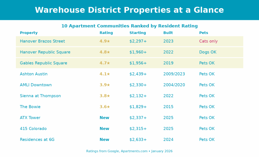 | Hanover Brazos Street | 215 Brazos St | 2023 | A+ | 4.9★ | Pricing includes concessions | $2,297–$14,651 |