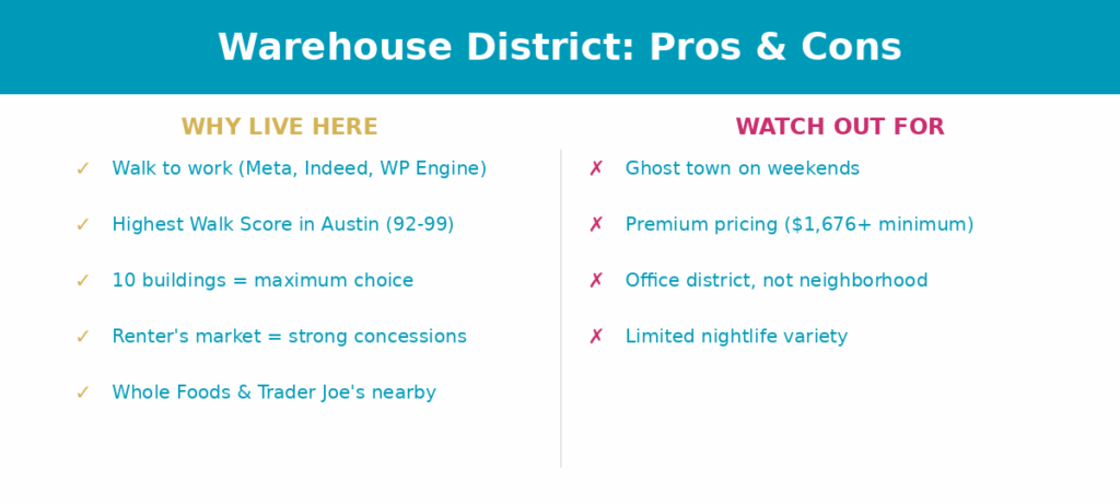 Let’s be real…the Warehouse District isn’t trying to charm you. It’s not going to win you over with quirky coffee shops or that “only in Austin” weirdness. What it offers is simpler: you walk to work, you come home to a well-managed building, and you don’t sit in I-35 traffic. That’s the trade.