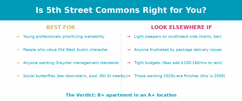 - Young professionals who prioritize walkability. If you work downtown or want to walk to Lady Bird Lake regularly, this location is hard to beat.
