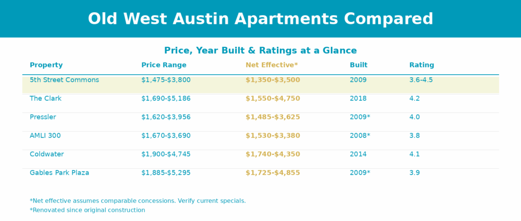 If location in Old West Austin is your priority and you want the best balance of price and livability, 5th Street Commons and Pressler are your top two. Tour both.