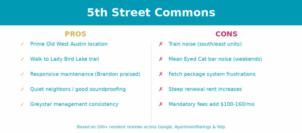 Here’s what a listing site won’t tell you: several reviews mention vehicle break-ins and package theft. This isn’t unique to 5th Street Commons—it’s a reality of urban Austin living, especially near downtown. The building has controlled access, night patrol, and gated parking.