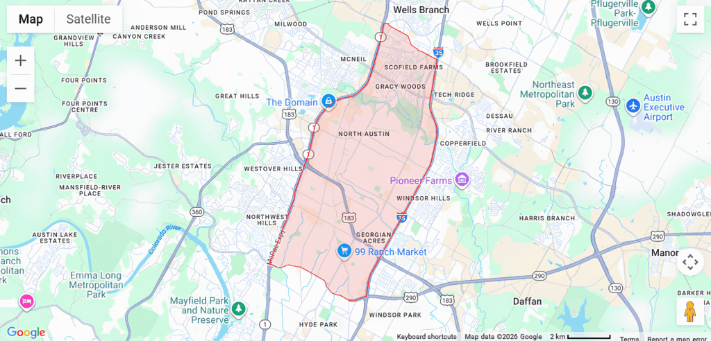 North Austin stretches roughly 8 miles from Anderson Lane up to Parmer Lane, bounded by Mopac on the west and I-35 on the east. That’s a massive footprint—larger than some Austin suburbs. Highway 183 cuts through the middle and creates a natural divide: properties south of 183 feel closer to central Austin’s energy, while north of 183 you’re firmly in suburban-urban territory where strip centers and office parks dominate.