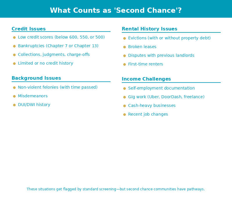 Let me clear up the biggest misconception right now: “second chance” doesn’t mean “anyone gets approved.” It means the community has established criteria for working with specific situations that other properties reject outright.