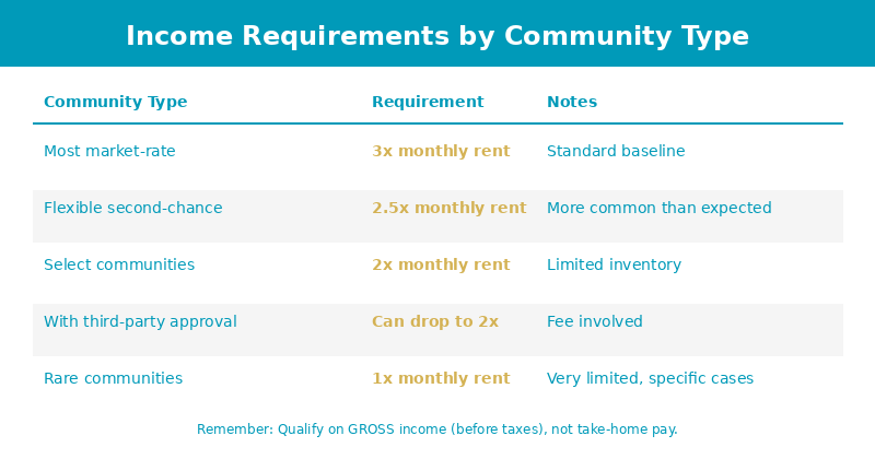 | Most market-rate communities | 3x monthly rent | This is the baseline |