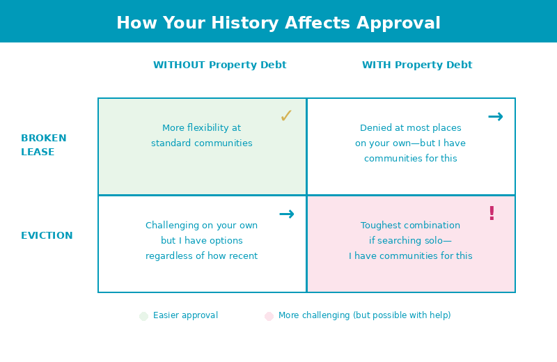 Multiple issues don’t eliminate your options, they just mean you need to know exactly where to apply. If you’re searching on your own, you’ll waste a lot of money on application fees at places that were never going to approve you. The key factor.s are: how recent are the issues, is there active property debt, and what’s your current income? This is exactly why working with someone who knows specific community criteria helps, I can tell you upfront which places will work with your combination, so you’re not throwing money away.