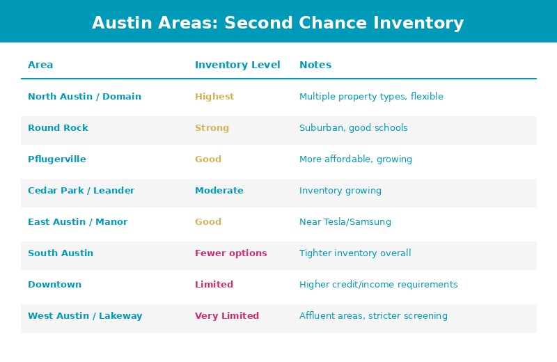North Austin and the Domain area have the highest concentration. Round Rock and Pflugerville also have strong inventory. East Austin and Cedar Park/Leander have moderate options. South Austin and Downtown have fewer options, not because communities won’t work with issues, but because Downtown especially has higher credit and income thresholds.