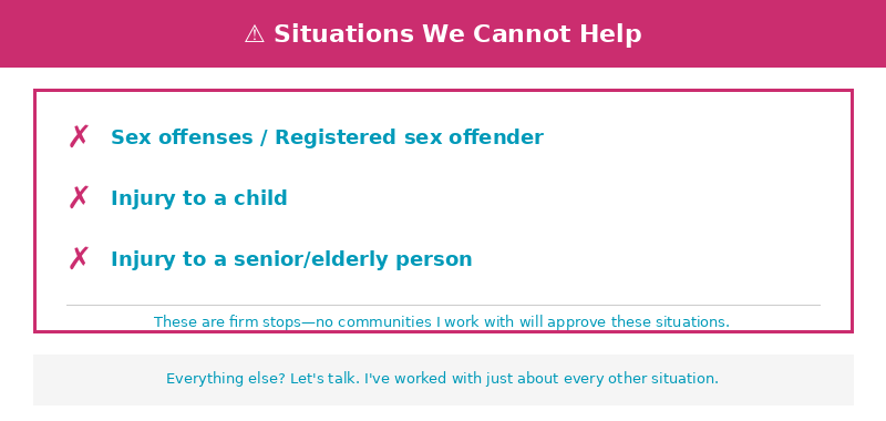 Because I want you to be honest with me about your situation. The more I know, the better I can match you with communities that will actually approve you. I’m not here to judge, I’m here to find you housing.
