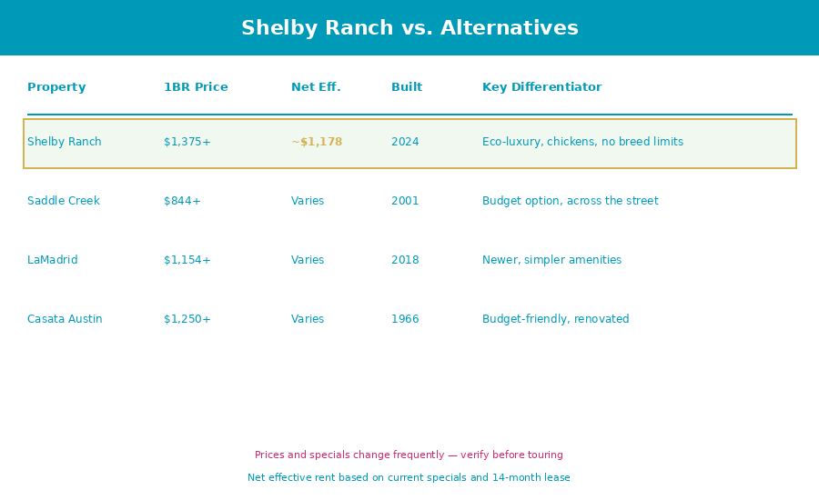 | Property | Distance | 1BR Price | Net Effective | Built | Key Difference |