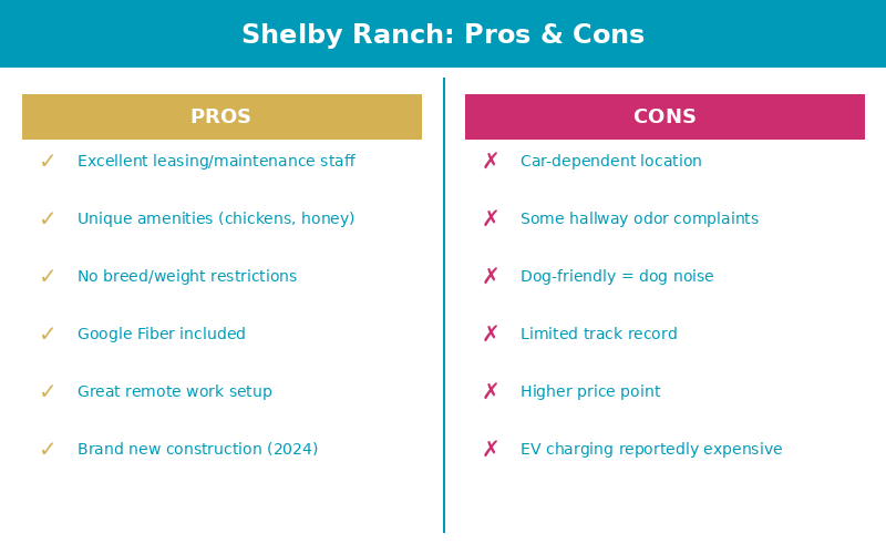 Shelby Ranch has everything you’d want in a brand-new Class A property: modern finishes, excellent amenities that actually deliver, Google Fiber, responsive maintenance, and a leasing team that genuinely seems to care. The eco-features aren’t just marketingâresidents confirm the eggs and honey are real and accessible.